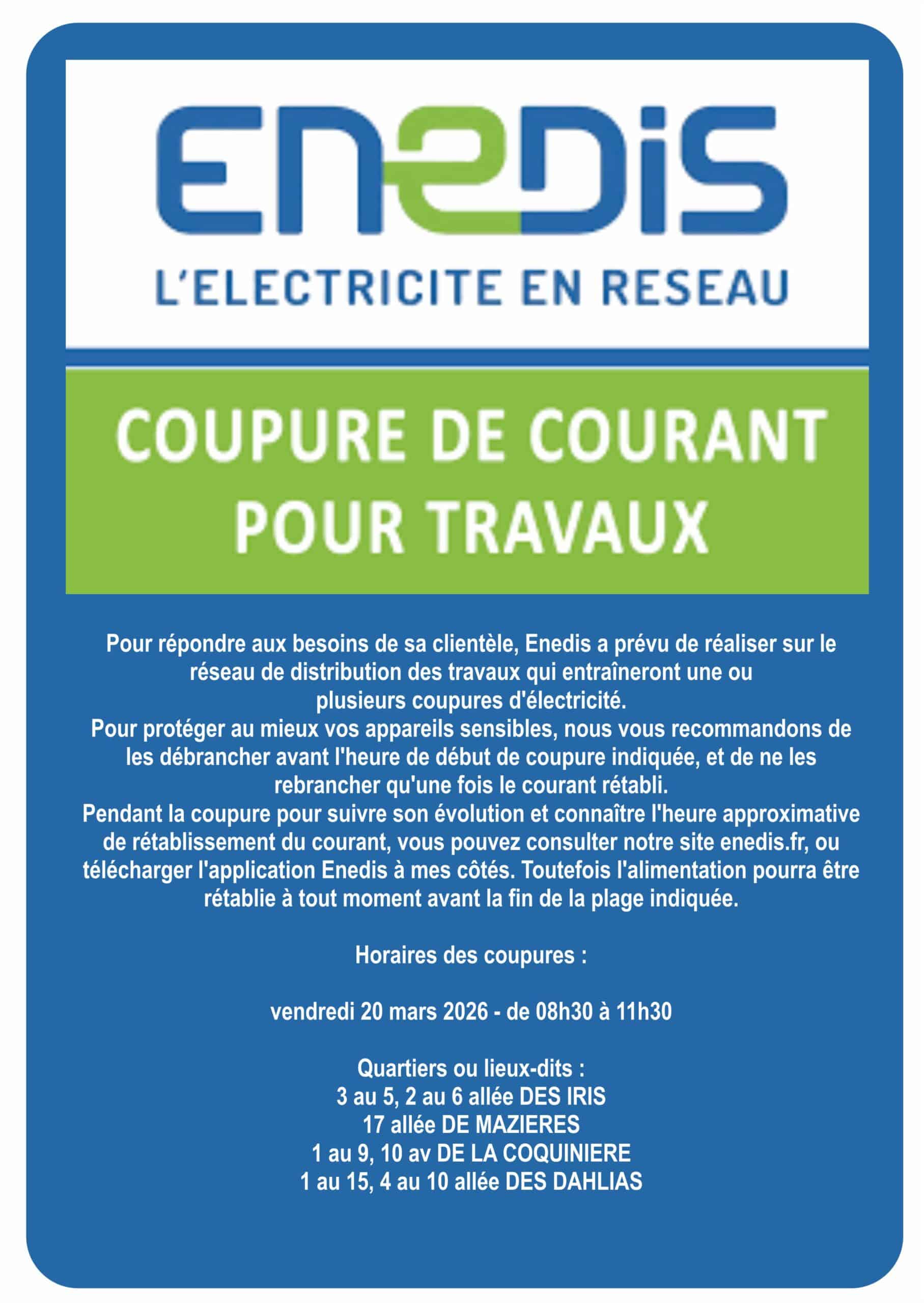 ENEDIS : Coupure de courant pour travaux