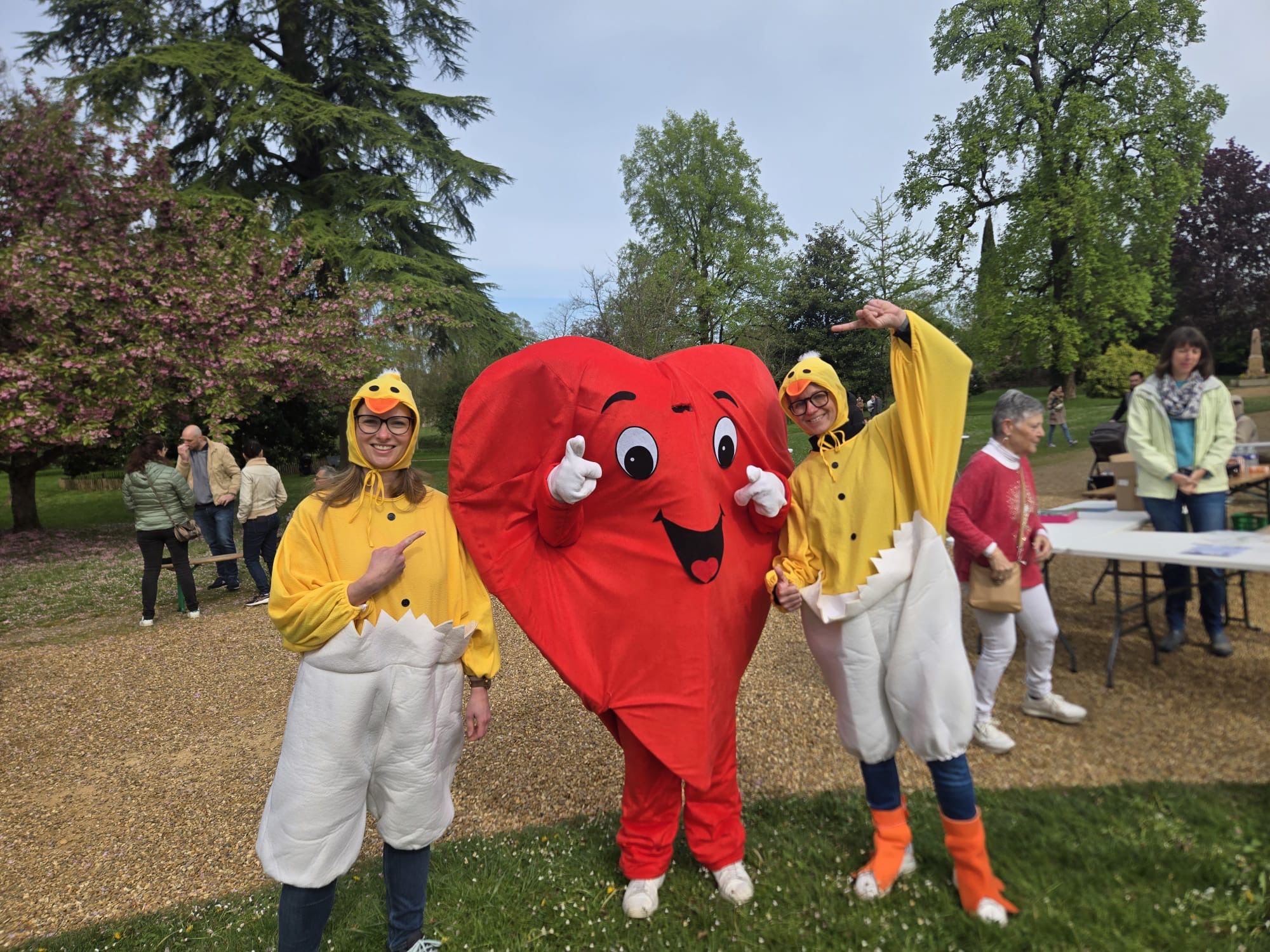 La mascotte du Parcours du Cœur s’est invitée à la chasse aux œufs en venant à la rencontre des enfants, sous le regard très sérieux des poules,