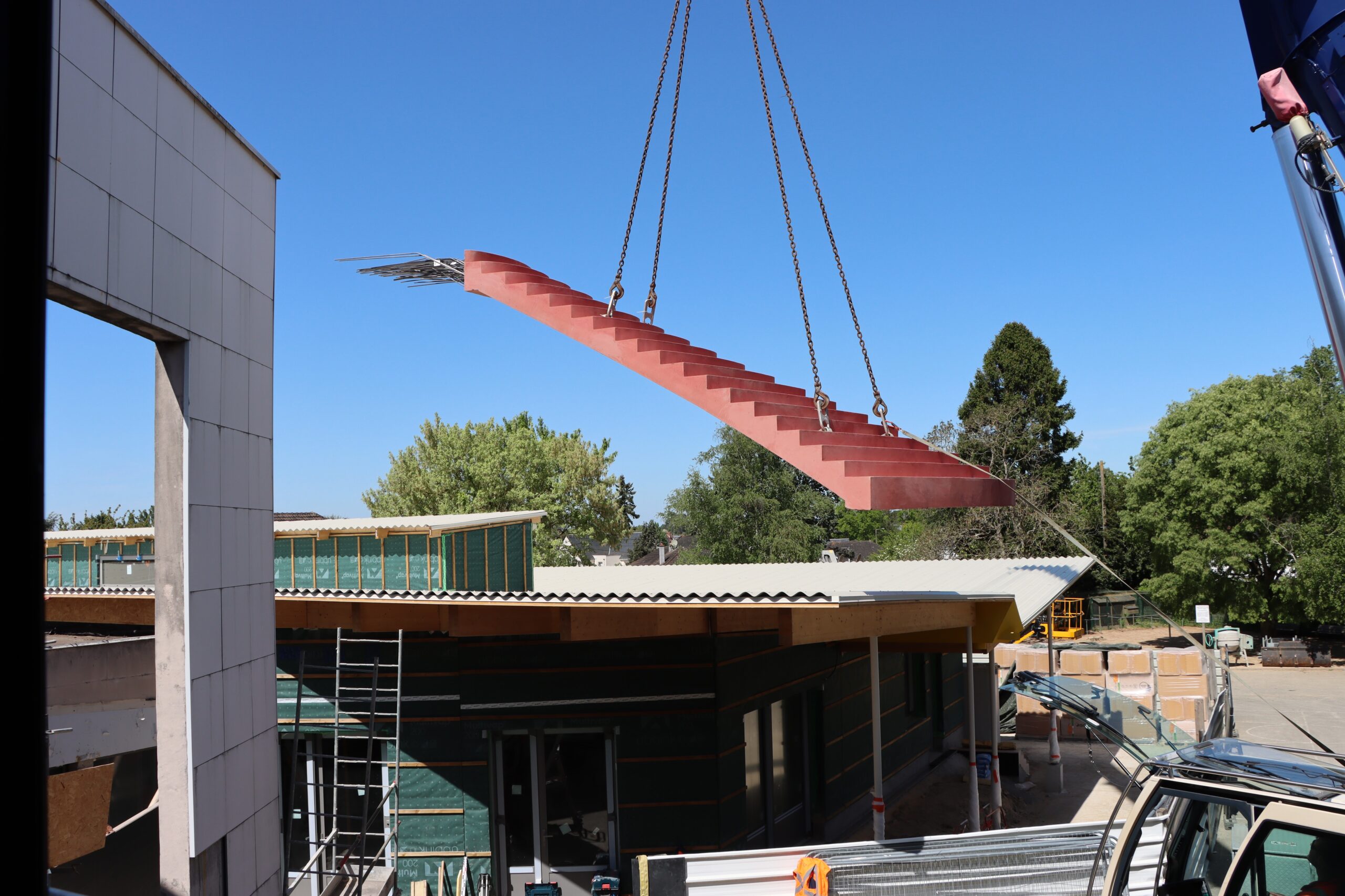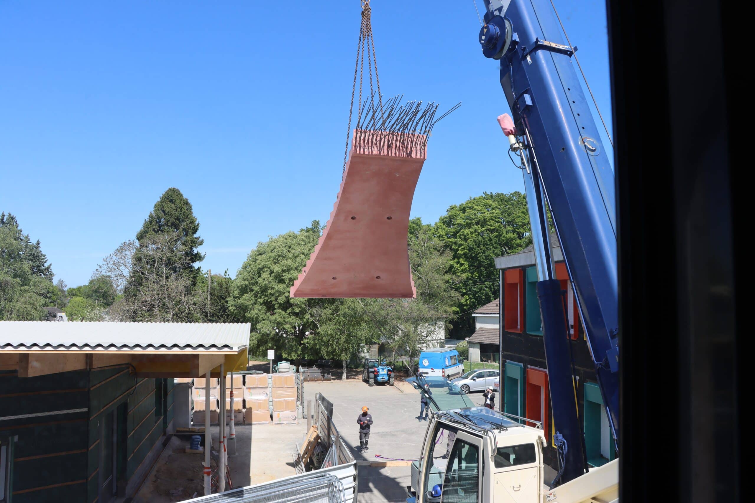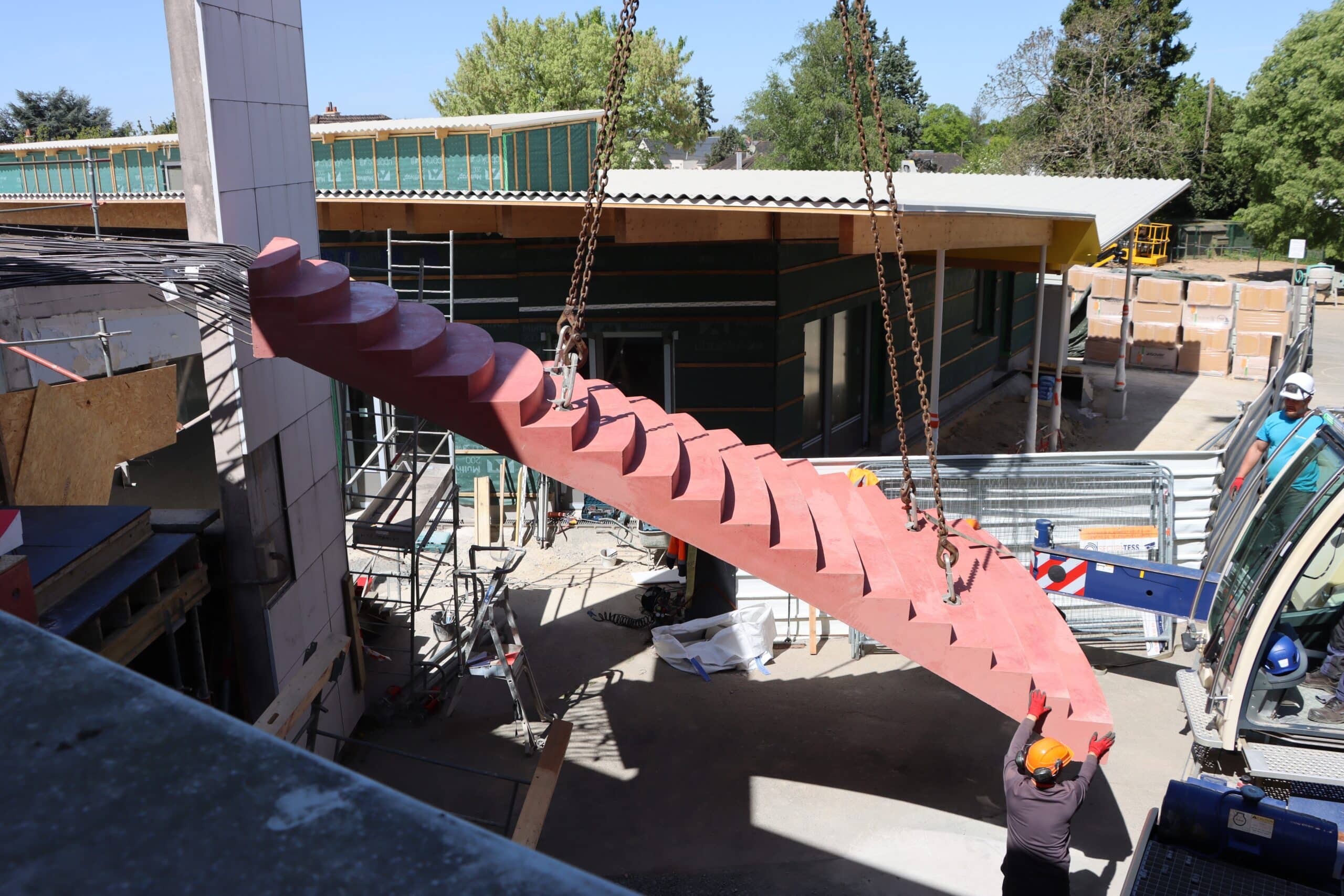 Une opération logistique hors norme : Le nouvel escalier, fabriqué sur mesure, a été acheminé en convoi exceptionnel jusqu’à l’école. En raison de ses dimensions imposantes et de son poids, son transport a exigé une coordination précise entre les services techniques et les équipes de chantier.