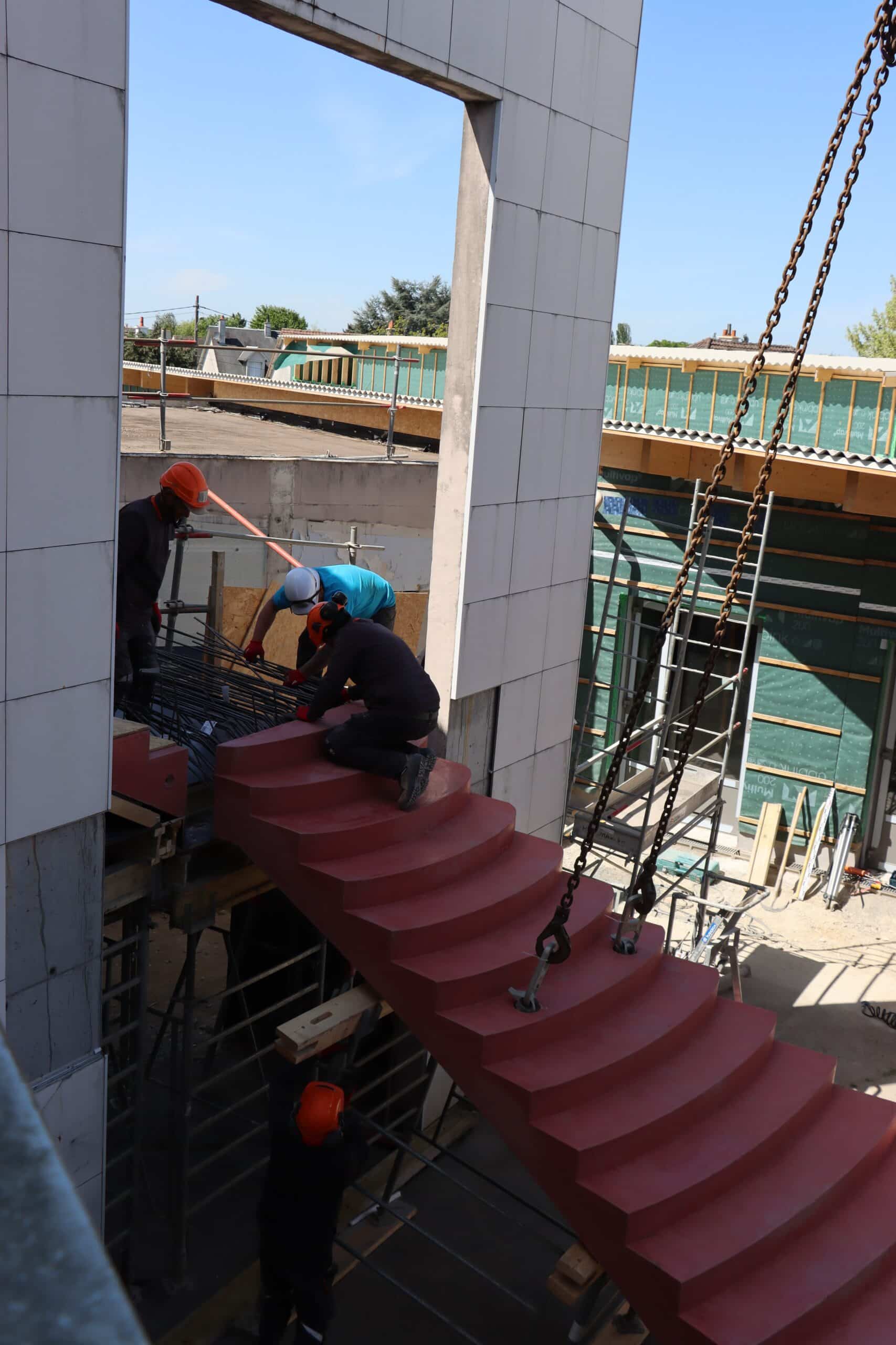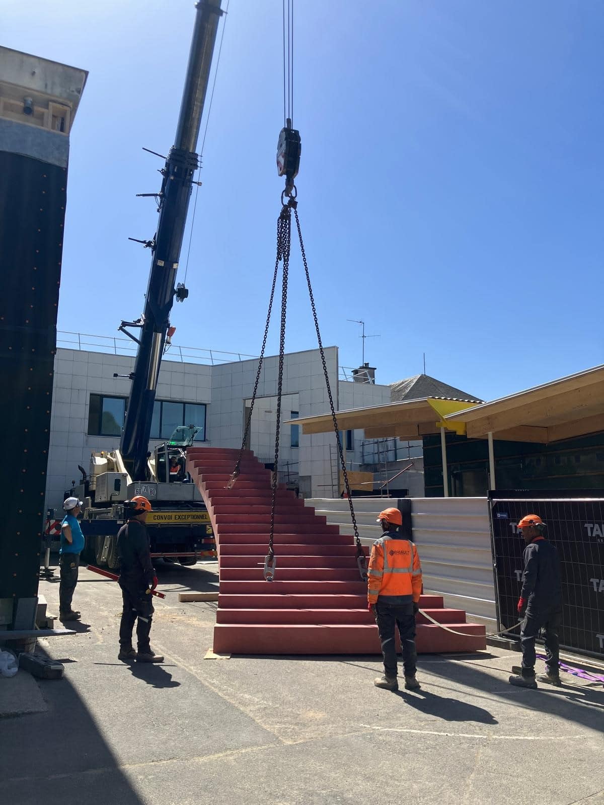 Dès les premières heures de la journée, les ouvriers étaient à pied d’œuvre pour assurer la mise en place de l’escalier. Leur expertise et leur rigueur ont permis de mener l’opération en toute sécurité, malgré les contraintes d’espace et la complexité de la manœuvre.